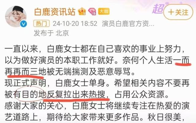 这场绯闻持续了两年才画上句号,白鹿资讯站发布声明,明确说明白鹿单身。